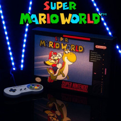 Il s’agit d’une toile lumineuse avec les illustrations de la boîte du célèbre jeu Super Nintendo Super Mario World.